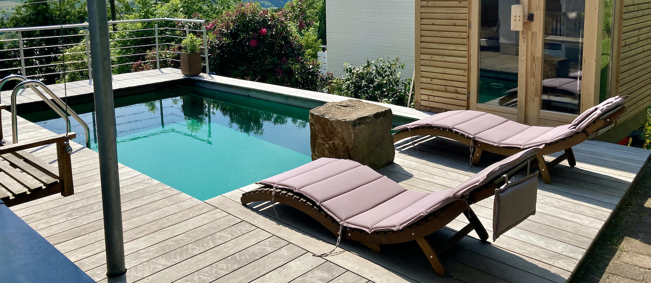 Le nettoyage est réalisé par une unité technique enterrée et un filtre à graviers plantés ou non. S'il y a peu d'espace, un filtre à sol peut être installé sous la terrasse en bois.